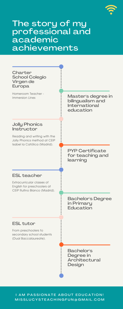 I am a primary school teacher, a certified PYP teacher (IB), and I have just completed a master’s degree in bilingualism and international education. I have 14 years of experience teaching English exclusively to infant and primary school children and I advise parents, detecting learning difficulties, providing practical solutions so that children can continue learning and improving their self-concept, self-esteem and, therefore, their school grades.